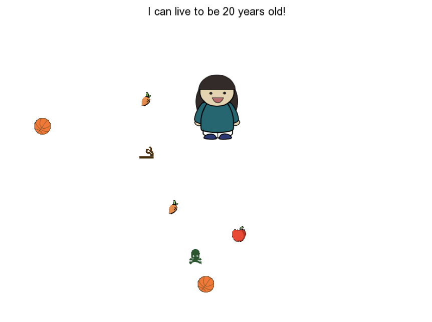 Description: What is your life expectancy? The advancement in logistics system and information technologies today has equipped people with a wider range of food and entertainment choices. However, the greater freedom of choices does not necessarily facilitate health. My game aims to warn people we are what we choose. Specifically, lifespan will decrease with choices of bad items such as beer and cigarette, and increase with choices of good ones such as carrots and basketball playing. Also, good items will appear in a patterned way while bad items appear randomly. This design aims to tell users that unexpected dangers and allures are everywhere to affect them; however, the development of a good habit requires strong self-control and self-discipline.