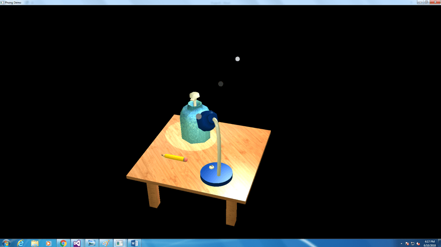 Description: The Magic Pencil was my attempt to bring into reality a traditional Chinese folklore – Ma Liang and His Magic Brush, in which painter Ma Liang draws everything necessary for poor people and turned them into realities with his magic brush. In this project, most objects were drawn with Bezier patches. Specifically, there is a lamp, a pencil and a sanitizer bottle on the table.